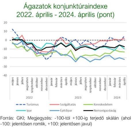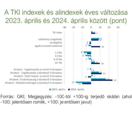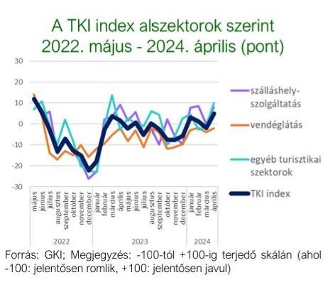 A TKI index 2024. áprilisban +5 ponton állt (-100 és +100 közötti skálán értelmezve), mely azt jelenti, hogy az ágazat szereplői helyzetüket pozitívnak érzékelték. Az index legutóbb 2022 júniusában állt ennél magasabb szinten. Értéke 7 ponttal nőtt az év negyedik hónapjában, ezzel 3 ponttal haladja meg az egy évvel ezelőtti értékét. A szálláshely-szolgáltatásban és a vendéglátásban éppen a márciusi visszaesést dolgozta le az index, míg az egyéb turisztikai szektorban is emelkedett, március után immár második hónapja.