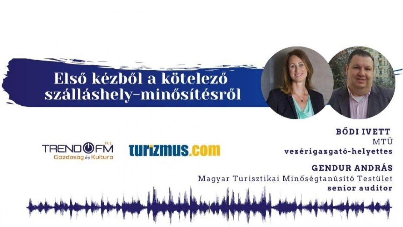 A szálláshelyek kötelező minősítéséről Bődi Ivettel, a Magyar Turisztikai Ügynökség turizmusstratégia megvalósításáért felelős vezérigazgató-helyettesével és Gendur Andrással, a Magyar Turisztikai Minőségtanúsító Testület Nkft. senior auditorával beszélgetett Érczfalvi András műsorvezető.