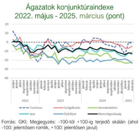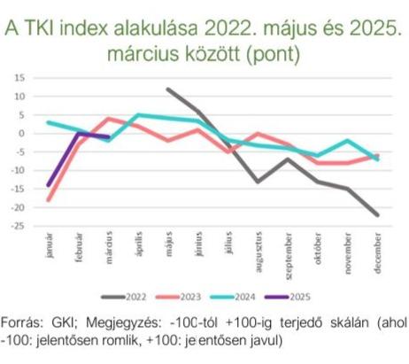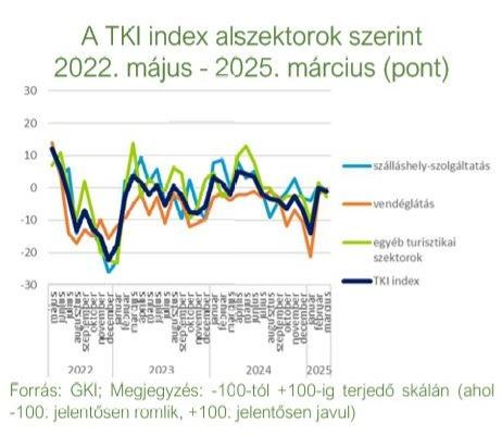 A TKI index 2025. márciusban -1 ponton állt (-100 és +100 közötti skálán értelmezve), mely azt jelenti, hogy az ágazat szereplői helyzetüket közel semlegesnek érzékelték. Az index értéke a múlthavi jelentős megugrás után 1 ponttal csökkent az év harmadik hónapjában, s így 1 ponttal meghaladja az egy évvel ezelőtti értékét. A szálláshely-szolgáltatásban 1 ponttal -1 pontra, az egyéb turisztikai szektorban 5 ponttal -3 pontra csökkent, míg a vendéglátásban 2 ponttal 0 pontra nőtt az index.