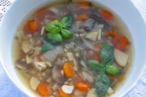 Először előkészítjük a hozzávalókat. A vöröshagymát megtisztítjuk, és durvára vágjuk, a sárgarépát és petrezselymet felkarikázzuk, a zellert és az almát kockázzuk, a káposztát leszeljük, a fokhagymát és a gombát szeletekre vágjuk. Az árpagyöngyöt alaposan átmossuk.