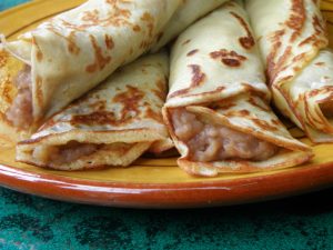 A megpihent palacsintatésztát tovább hígítjuk szódával, és olajozott serpenyőben a szokásos módon kisütjük. Tányérra borítjuk, közepébe egy csík tölteléket halmozunk, feltekerjük, és úgy kínáljuk.
