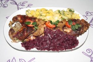 Hozzávalók: 2 kg nyúlhús (egy egész nyúl hátsó része), só, 1 kávéskanál őrölt paprika, 1 kávéskanál őrölt feketebors, 1 teáskanál majoránna, 4 gerezd fokhagyma, 20 dkg füstölt szalonna, 1 kg alma. A párolt káposztához: 60 dkg lila káposzta, só, 2 evőkanál étolaj, 3 evőkanál cukor, 1 kis fej vöröshagyma, 1 evőkanál 20 %-os ecet, csipetnyi őrölt kömény. A burgonya körethez: 1 kg krumpli, 1 evőkanál sertészsír, 1 csokor petrezselyem, só.