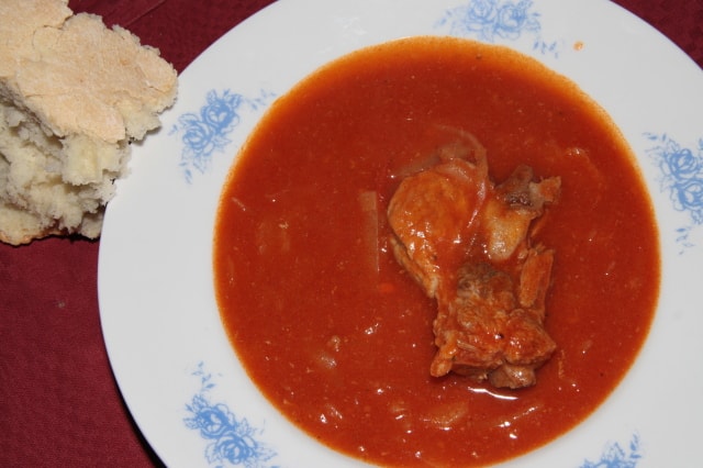 A felaprított vöröshagymát a zsírban üvegesre pároljuk. A húsokat kisebb darabokra vágjuk, és ráborítjuk a hagymás zsírra. Öt percig kevergetve sütjük, majd hozzáadjuk a sárgarépát, petrezselymet, és a csokorba kötött zöldet is. Enyhén sózzuk, majd felengedjük vízzel.