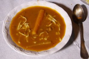 Hozzávalók: 50 dkg tarkabab, 2 sárgarépa, 2 petrezselyem, 1 kis darab zeller, 2 paradicsom, 1 paprika, 1 csokor zellerzöld, 2 burgonya, 1 dl paradicsomlé, 1 evőkanál sertészsír, 2 fakanál liszt, 1 púpos teáskanál őrölt paprika, 2 gerezd fokhagyma, só.
