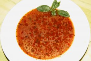 Hozzávalók: 1 újhagyma, 1 sárgarépa, só, 1 evőkanál cukor, 7 dl paradicsomlé, csipetnyi őrölt feketebors, 1 evőkanál liszt, 2 evőkanál étolaj, 1 teáskanál őrölt paprika, 1 csokor bazsalikom, pár szál zeller zöld – és oregano, 2 evőkanál tarhonya.