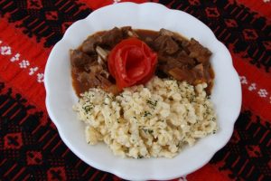 Közben elkészítjük a nokedlit. A kaprot apróra vágjuk. Egy tálban összetörjük a túrót, ráborítjuk a lisztet, csipetnyi sóval, négy tojással, a kaporral és kevés vízzel nokedli sűrűségű masszát keverünk belőle. Ezt forró, sós vízbe beleszaggatjuk, kifőzzük, leszűrjük, és tálba borítjuk.