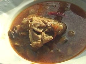 Hozzávalók (20 főre): 80 dkg vöröshagyma, 40 dkg paradicsom és paprika, 25 dkg füstölt szalonna, 1 kg gomba, 4 kg csirkehús, 20 dkg sertészsír, 6 púpos evőkanál őrölt pirospaprika, 1 csokor petrezselyem zöldje, 1 csípős paprika, 2 babérlevél, 1 teáskanálnyi őrölt feketebors, 2 evőkanál só, csipetnyi kakukkfű, 4 gerezd fokhagyma, 1 dl vörösbor.