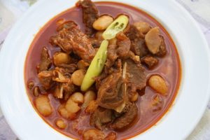 Hozzávalók: 2 kg birkahús (oldalas, lapocka, comb), 1 kg száraz nagyszemű fehérbab, 2 evőkanál sertészsír, 2 vöröshagyma, 4 gerezd fokhagyma, 2 teáskanál őrölt feketebors, 2 teáskanál őrölt kömény, 2 teáskanál só, 1 evőkanál őrölt paprika, 1 paradicsom, 1 zöldpaprika.