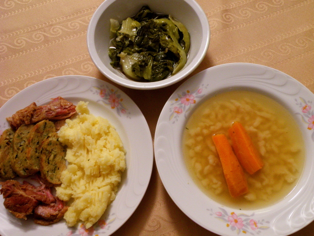 Amikor a leves alapunk felforrt, fűszerezzük az egész fahéjjal, szegfűszeggel, és ízesítjük cukorral. Pár perces forralás után habverővel folyamatosan keverve hozzáadjuk a habarást. Felforraljuk, és a feldarabolt kifli szeletekre forrón tálaljuk.