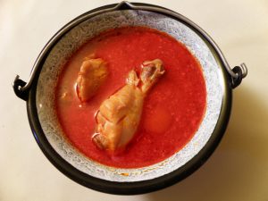 Közben a paprikát feldaraboljuk, a paradicsomok héját lehúzzuk, és felkockázzuk. Egy nagyobb fazékban egy liter vizet felmelegítünk. A hagymára rászórjuk az őrölt paprikát, és beleöntjük a vízbe. Hozzátesszük a csirkedarabokat, 5-10 percig forraljuk együtt, majd hozzáadjuk a paprikát, paradicsomot, és a halászlé alapot. Egy, másfél órán át főzzük.