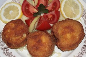 Lisztbe, felvert tojásba és zsemlemorzsába forgatjuk, és forró olajban, közepes lángon mindkét oldalán aranyló barnára sütjük.