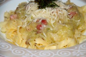 Hozzávalók: 1,5 kg cukkini, 15 dkg füstölt szalonna, 3 kisebb vöröshagyma, 15 dkg sajt, só, őrölt fehérbors, 50 dkg száraz tészta (széles metélt), 2 evőkanál étolaj.