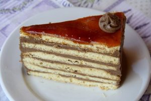 A legfelső lapra negyven deka cukorból karamellt készítünk, és még forrón bevonjuk vele. Kihűlés előtt vajjal megkent késsel tortaszeleteket vágunk bele, és hagyjuk megszilárdulni.