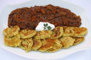 Hozzávalók: 50 dkg krumpli, 15 dkg liszt, 1 teáskanál só, 50 dkg csiperkegomba, 30 dkg vargánya, 10 dkg füstölt szalonna, 15 dkg vöröshagyma, 1 evőkanál őrölt paprika, 1 dl tejföl, 5 dkg liszt, só, csipetnyi őrölt bors.