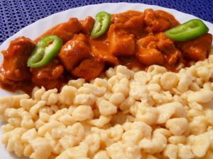 A hozzávalókból kevés vízzel nokedli tésztát készítünk, amit enyhén sós, olajos, forró vízben kifőzünk. Ezzel tálaljuk a harcsapaprikást.