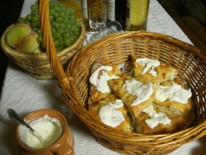 Közben a tepertőt kis darabokra vágjuk, a sajtot lereszeljük. A fokhagymát megtisztítjuk, és a tejfölbe nyomjuk.