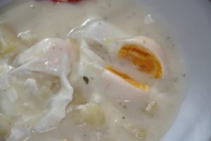 A levest behabarjuk, majd amikor újra felforrt, egyenként belecsurgatjuk a tojásokat is. Ezután már nem keverjük.