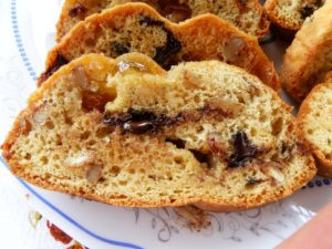 Az aszalt gyümölcsöt, csokoládét, diót és cukrot kisebb darabokra vágjuk, és kevés liszttel megszórjuk. Beleöntjük a tésztába, majd óvatosan összeforgatjuk.