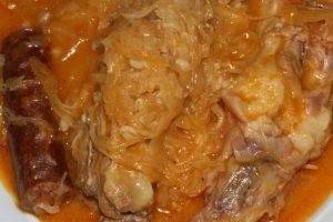 Hozzávalók: (6 főre) másfél kg savanyú káposzta, 2 disznófarok, 60 dkg füstölt kolbász, 50 dkg sertés lapocka (comb), 20 dkg füstölt szalonna, 2 vöröshagyma, 6 evőkanál árpagyöngy, 2 babérlevél, őrölt feketebors, só. A rántáshoz 3 evőkanál zsír, 3 evőkanál liszt, 3 teáskanál őrölt paprika.