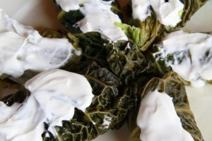 A tepsit vajjal vékonyan kikenjük. A kelkáposzta közepébe egy evőkanálnyi gombás tölteléket halmozunk, a leveleket két oldalról felhajtjuk, és rolónak feltekerjük.
