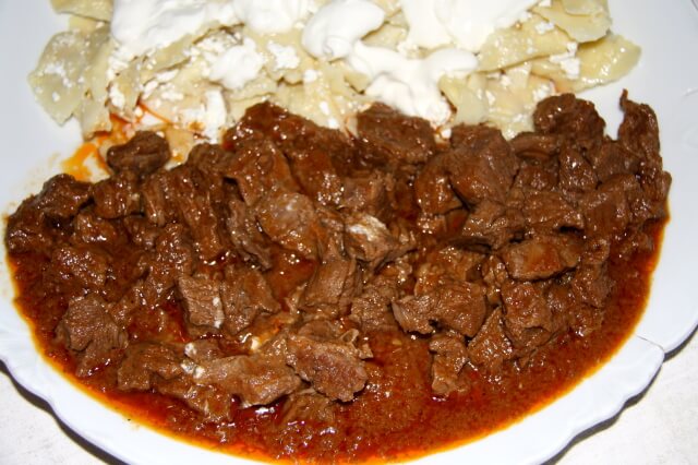 Hozzávalók: 5 tojás, 3 evőkanál búzadara, 50 dkg liszt, 3 dl víz, 3,5 teáskanál só, 5 közepes nagyságú vöröshagyma, 1,5 dl étolaj, 2 evőkanál őrölt paprika. A salátához: 3 kisebb saláta, 4 gerezd fokhagyma, 1 evőkanál étolaj, 2 kávéskanál só, 5 evőkanál cukor, fél liter víz, 2 evőkanál ecet. A főzővízbe 2 teáskanál só. A tálaláshoz vágott petrezselyem zöldje, 1 dl tejföl.