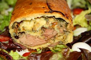 Hozzávalók: (2 rúdhoz) 50 dkg liszt, 30 dkg vaj, 2 dl tej, 1 teáskanál cukor, 2 dkg élesztő, 1 csokor petrezselyemzöld, 50 dkg kacsamáj, 30 dkg márványsajt, 15 dkg pirított dió, 2 tojás, 1 teáskanál só, 1 evőkanál kacsazsír, csipetnyi őrölt bors, 5 dkg aszalt paradicsom, vegyes kerti zöldfűszer, tetejére 1 tojás. A tálaláshoz friss salátalevelek, balzsamecet.