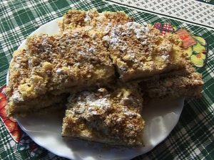 Hozzávalók: 45 dkg liszt, 20 dkg sertészsír, 2 tojás, csipetnyi só, 1 citrom reszelt héja. A tepsi kikenéséhez sertészsír. A tésztára 6 púpos evőkanál baracklekvár, 5 evőkanál kristálycukor, 2 vaníliás cukor, 15 dkg darált dió.