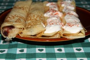 Ezeket megtöltjük káposztával, feltekerjük, tetejükre fokhagymás tejfölt kenünk, és enyhén megszórjuk őrölt paprikával. Úgy is készíthetjük, hogy a káposztára szilvalekvárt csepegtetünk, ezzel együtt is nagyon finom.