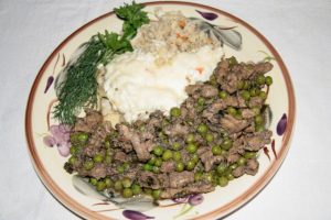 Hozzávalók: (12 főre) 3 kg sertéslapocka és comb vegyesen, 1,5 kg vöröshagyma, 1,5 kg zöldborsó, 50 dkg sertészsír, 1 púpos evőkanál só, őrölt feketebors, 1 nagy csokor kapor, 1 nagy csokor petrezselyemzöld. A körethez: 50 dkg árpagyöngy, 4 evőkanál szárított zöldség, 2 evőkanál só, 2 evőkanál őrölt feketebors, 25 dkg juhtúró, 20 dkg reszelt sajt, 1 evőkanál zsír.