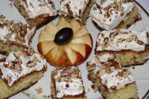A diót kisebb darabokra vágjuk. Amikor a süti már majdnem kész, a tojások fehérjét felverjük. Húsz deka cukrot, és egy vaníliás cukrot is hozzáadunk, és a forró tészta tetejére kenjük. Vágott dióval gazdagon megszórjuk, és 15 percre visszatoljuk a sütőbe.