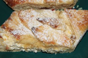 Hozzávalók: 50 dkg liszt, 5 evőkanál porcukor, 1 tojás sárgája, csipetnyi só, 2,5 dkg élesztő, 1 dl tej, 50 dkg túró, 5 dkg mazsola, 12 dkg sertészsír, 12 dkg vaj, 1 evőkanál búzadara, fél (bio) citrom reszelt héja, 2 egész tojás.