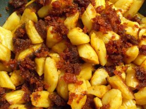 A krumplit héjában megfőzzük, meghámozzuk, és teljesen kihűtjük. A legjobb, ha ezt előző este elkészítjük, és másnap könnyebben lereszeljük. Ízlés szerint sózzuk, és liszttel összedolgozzuk. Lisztezett táblára borítjuk, és ott is gyúrjuk egy ideig. Kisebb darabokra vágjuk, hosszú rudakat sodrunk belőle.