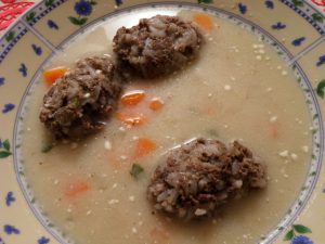 Közben zöldséglevest készítünk. A sárgarépát, petrezselyem gyökeret, és karalábét kis kockákra vágjuk, fazékba tesszük. Fűszerezzük sóval 1 teáskanál borssal és szegfűborssal, majd felöntjük vízzel, és a belsőségek főzőlevével. Puhára főzzük.