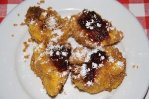 A tetejét gazdagon megcsepegtetjük szilvalekvárral, és a megmaradt morzsás darát is a tetejére szórjuk.