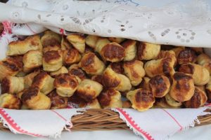Ezután lisztezett deszkán kisodorjuk, négy oldalról felhajtjuk, és húsz percig kelesztjük. Ezt a műveletet megismételjük, mindig ugyanúgy hajtogatjuk, akkor lesz szép leveles. Újabb pihentetés után kisodorjuk, berácsozzuk a tetejét, és kis pogácsákat szaggatunk belőle.