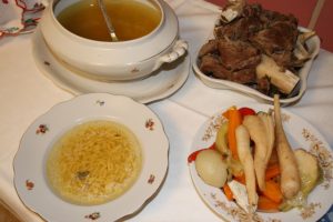 A megfőtt levesből a húsokat és a zöldségeket külön tálaljuk, a levest pedig a csigatésztára szedjük ki.