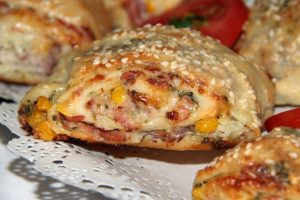 A megkelt cipókat egyenként téglalap alakúra kisodorjuk, megkenjük medvehagymás krémmel, megszórjuk sonkával, lila hagymával, kukoricával, sajttal. Nagyon kevés, 1-2 evőkanál étolajat locsolunk rá. Ezekkel együtt feltekerjük, és a rudakat tojásos tejföllel átkenjük. Szezámmaggal megszórjuk, és öt centis darabokra felvágjuk.