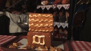 A tojásfehérjét porcukorral kemény habbá verjük. Ezzel ízlés szerint feldíszítjük a házikó egyes elemeit, és a kiszaggatott formákat. Ha gyors száradást szeretnénk, akkor öt percre betesszük a sütőbe (ilyenkor kicsit megbarnul a díszítés), de egy éjszakát pihentetve magától is megszárad a máz a tésztán.