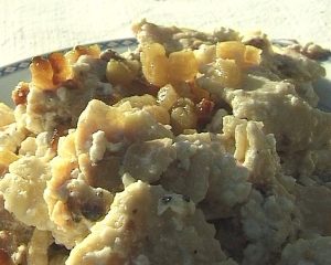 Hozzávalók: 3 tojás, 45 dkg liszt, só. Az öntethez: 15 dkg füstölt szalonna, fél liter tejföl, fél kg túró.