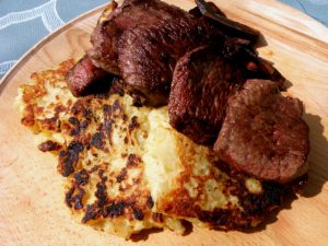 Pácolt szarvasgerinc mézes birsalmával és burgonyalepénnyel