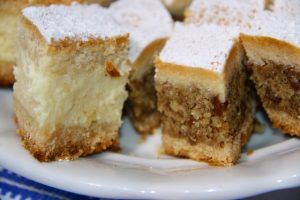 Hozzávalók: Tészta (egy nagy tepsi béleshez): 1 kg liszt, 50 dkg sertészsír, 25 dkg cukor, 1,75 dl tejföl, 2,5 dkg élesztő, 1 sütőpor, 1 kávéskanál só, 10 dkg vaj, 1 tojás sárgája. Diós töltelék (egy tepsihez): 1 kg dió, 5 dkg kenyérmorzsa, 50 dkg cukor, 10 dkg mazsola, kb. 3 evőkanál víz, 1 tojás fehérje. Túrós töltelék: 1 kg jó minőségű túró, 3 tojás, 50 dkg cukor, 3 csomag vaníliás cukor, 5 púpos evőkanál liszt, 2 evőkanál búzadara. A tetejére porcukor.