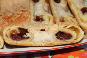 A megkelt tésztát három részre vágjuk, és mindegyiket tepsi nagyságúra kinyújtjuk. Megkenjük lekvárral, és mindkét hosszabbik oldalát egy sorban megrakjuk meggyel. A süteményt a közepe felé feltekerjük, de középen hagyunk egy két centis rést. Kizsírozott tepsibe emeljük, és az üres helyre kókuszhabot halmozunk.