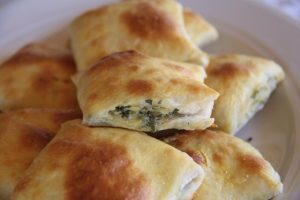 Hozzávalók: 1 kg liszt, 1 evőkanál fagyos zsír, 1,5 evőkanál só, langyos víz, 1,5 kg héjában főtt krumpli, 0,5 liter tejföl, 1 csokor petrezselyemzöld, olvasztott zsír, 2 tojás.