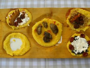 A tányérokba, a puliszka alá kevés átmelegített szalonnazsírt kanalazunk, erre tesszük a puliszkát. Szétterítjük a tányérban.