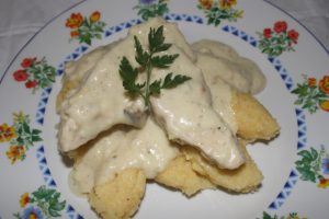 Hozzávalók: 1,5 kg pulykamell, só, 1 csokor kakukkfű, teáskanálnyi őrölt feketebors, 2 babérlevél, 2 evőkanálnyi margarin, 6 gerezd fokhagyma, 3 dl tejszín, 2 evőkanál liszt, 2 evőkanál tejföl. A puliszkához: 35 dkg kukoricadara, 1 teáskanál só, 2 evőkanál sertészsír.