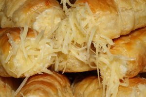 Olajjal kikent tepsibe, kis távolságot hagyva elhelyezzük a rolókat, tetejüket felvert tojással átkenjük, és forró sütőben 20-25 perc alatt megsütjük. A rudakat kinyomjuk belőle, és nyomózsák segítségével mindegyiket megtöltjük sajtkrémmel. A maradék öt deka sajtot is lereszeljük, és a végeit belemártjuk, így helyezzük tálcára.