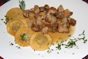 Hozzávalók: 1 kg sertéscomb, 30 dkg gomba, 15 dkg gyöngyhagyma, só, 1 kávéskanál őrölt bors, 2 babérlevél, 1 szál rozmaring, 1 csokor kakukkfű, 8 gerezd fokhagyma, 3 evőkanál sertészsír, 1 evőkanál liszt, 1,5 dl fehérbor, 1,5 dl hús alaplé. A derelyéhez: 25 dkg liszt, 3 tojás, 2 tojás sárgája, só, 1 kávéskanál őrölt bors, 5 dkg főtt burgonya, 5 dkg szárított szegfűgomba, 20 dkg csiperkegomba, 1 csokor petrezselyemzöld, 1 vöröshagyma, 1 evőkanál zsír, 6 dkg vaj.