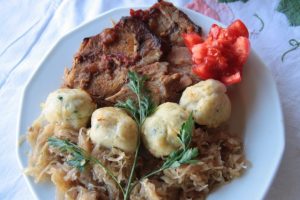 Tálaláskor a fűszeres lével meglocsolt tarjaszeletek mellé sorakoztatjuk a gombócokat, mellé párolt káposztát kínálunk.