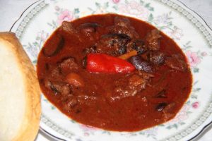 Hozzávalók: (8 főre) 2,5 kg birkacomb, 50 dkg fekete virágbab, 3 nagyobb vöröshagyma, 2 paradicsom, 3 tv-paprika, 30 dkg sárgarépa, 30 dkg petrezselyem, 1 nagy csokor petrezselyemzöld, 4 db cseresznye paprika, 1 fej fokhagyma, 25 dkg füstölt szalonna, 1 kávéskanál őrölt kömény, 3 teáskanál őrölt feketebors, 3 babérlevél, ízlés szerint só, 3 púpos evőkanál őrölt paprika.