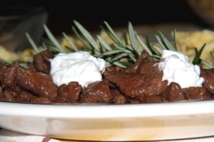 Hozzávalók: (8 főre) 2 kg szarvas comb, 20 dkg füstölt szalonna, 3 vöröshagyma, 4 gerezd fokhagyma, 2 babérlevél, 2 paprika, 2 dl paradicsom sűrítmény, 1 teáskanál őrölt fehérbors, 2 ág rozmaring, 2 evőkanál sertészsír, 2 dl fehérbor, 1 evőkanál só. A nokedlihez: 50 dkg liszt, 4 tojás, 1 teáskanál só. Az uborkasalátához: 1 kg uborka, 1 teáskanál só, 1 evőkanál ecet, 3 evőkanál cukor, 1 teáskanál őrölt paprika.